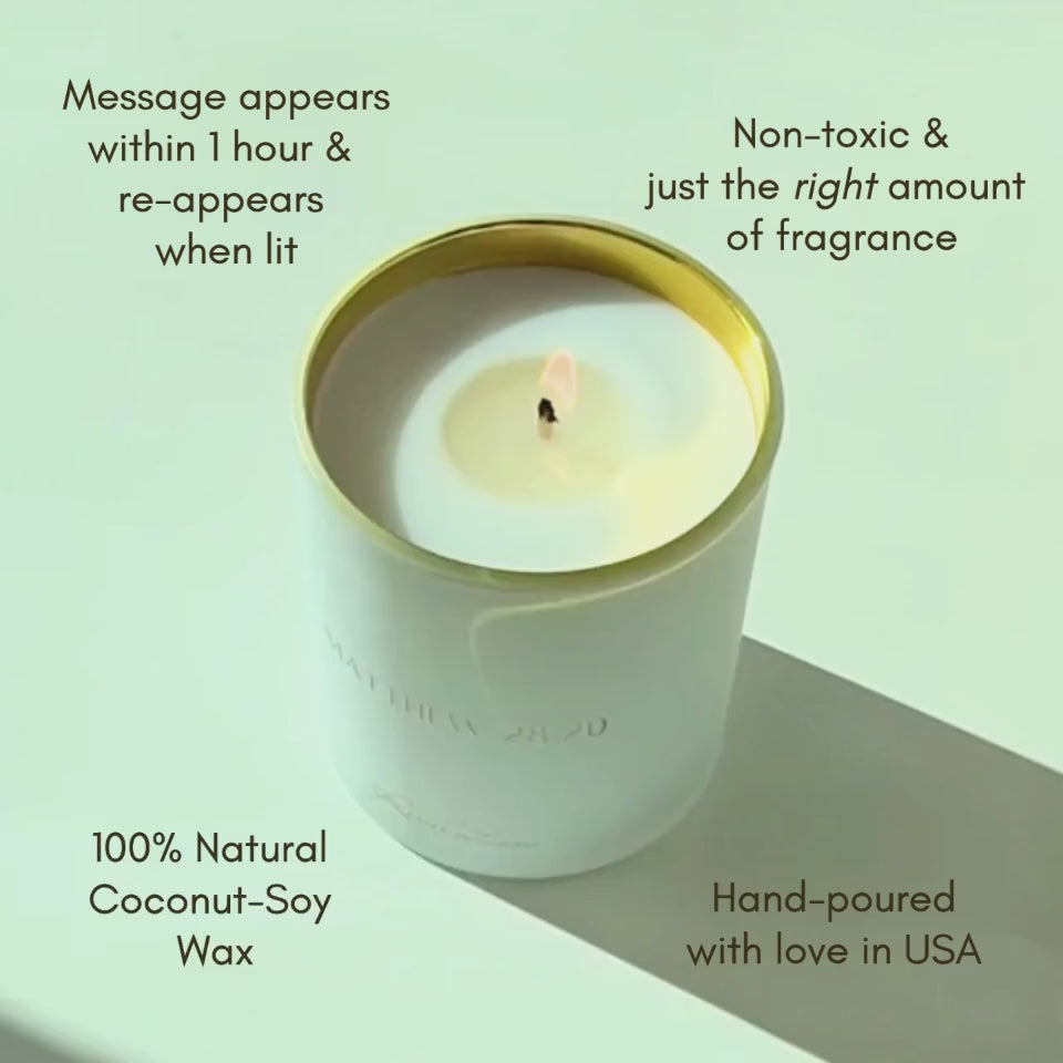 The first & only candle on the market that reveals a hidden Bible verse or special message after the candle is lit. Hand poured with love in California with natural & premium ingredients.